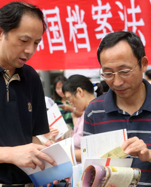 2007年9月5日,上海舉行紀(jì)念《中華人民共和國檔案法》頒布20周年檔案宣傳咨詢活動,此次活動面向公眾宣傳檔案法律知識,開展檔案便民活動。上海各級檔案館當(dāng)時已總計開放檔案180余萬卷,在史料展示、信息公開、便民服務(wù)等方面發(fā)揮了重要作用。新華社記者劉穎/攝 |