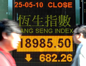 5月25日,市民從香港灣仔一家銀行的恒生指數(shù)電子顯示屏前走過。當日,香港恒生指數(shù)下跌682.26點,收報18985.50點,下跌3.47%。新華社記者 黃本強 攝