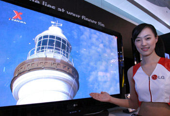 第九屆北京科博會上,工作人員在展示一款數(shù)字高清電視機。新華社記者 龐興雷/攝 |