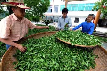 武夷山茶農(nóng)按傳統(tǒng)制作技藝對茶青進行手工搖青!∮浾摺垏/攝