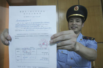 7月20日,在德清縣俞氏塑料制品有限公司,德清縣工商局執(zhí)法人員展示依據(jù)《網(wǎng)絡(luò)商品交易及有關(guān)服務(wù)行為管理暫行辦法》發(fā)出的《責(zé)令改正通知書(shū)》。新華社發(fā) |