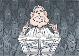 《今日美國(guó)報(bào)》和蓋洛普公司本周公布的一項(xiàng)最新民意調(diào)查顯示,美國(guó)總統(tǒng)布什的支持率跌至近幾十年來歷任美國(guó)總統(tǒng)的新低,僅僅有29%。布什的國(guó)內(nèi)外各項(xiàng)政策都沒有得到好的反響。 在漫畫中,作為樂隊(duì)指揮,布什“不辭辛勞”地獻(xiàn)上一首首曲子,既有國(guó)內(nèi)雅調(diào),又有國(guó)外名曲;既有能源、環(huán)境大餐,又有教育等小菜。然而,不管這位指揮家如何自鳴得意,臺(tái)下的聽眾無一不是緊捂耳朵,不愿再聽。