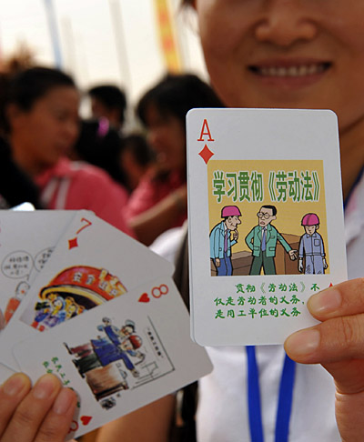 7月28日,一名職工展示普法撲克牌。當(dāng)日,寧夏召開“法律進(jìn)寧東能源化工基地”現(xiàn)場(chǎng)會(huì),在會(huì)上向企業(yè)員工發(fā)放《法律知識(shí)讀本》、維權(quán)聯(lián)系卡和普法撲克牌,宣傳依法維權(quán)知識(shí)。