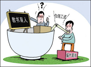 河南省郟縣有252個“編外離崗”教師,有的還不到40歲,但待遇卻與在職教師相同,坐在家里什么都不用干,工資照拿不說,而且還能晉檔晉級,被戲稱為“白領”——白白領工資(9月14日 《中國青年報》)。 編外離崗算帶薪,捷足先登當白領。 坐家晉升不費事,笑納工資與獎金。 世間最重是公平,教育腐敗傷人心。 撕破臉皮查個透,到底是誰得了?
