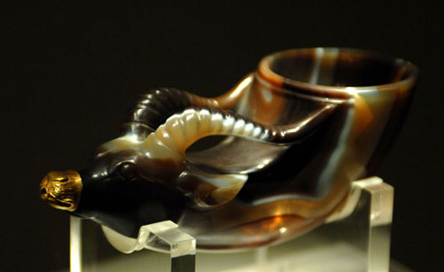 日前,《大唐遺寶——何家村窖藏出土文物展》在陜西歷史博物館開(kāi)展。這次展覽匯聚陜西歷史博物館收藏的何家村窖藏出土文物300余件,是何家村窖藏出土文物出土以來(lái)首次大規(guī)模集中展示!拔靼埠渭掖褰巡亍保1970年出土于西安市何家村而得名。其出土文物因數(shù)量眾多、種類繁復(fù)、工藝精美、保存完好著稱于世,被譽(yù)為二十世紀(jì)隋唐考古最為重要的考古發(fā)現(xiàn)之一。圖為正在展出的鑲金獸首瑪瑙杯。