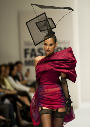 4月13日,在墨西哥首都墨西哥城,頭戴夸張頭飾的模特在梅賽德斯-奔馳時(shí)裝周上展示新款時(shí)裝。