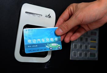 日前,位于杭州城西古翠路的杭州首座智能電動(dòng)汽車(chē)充電站落成。圖為充電站一名工作人員演示電動(dòng)汽車(chē)充電卡使用方法。新華社記者 韓傳號(hào)