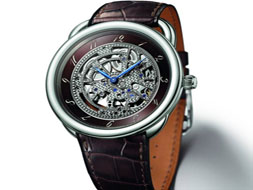 時尚愛馬仕(Hermès)Arceau鏤空馬鞍鉑金腕表愛馬仕首次推出鉑金腕表,其美學(xué)理念顯而易見:可視機(jī)芯經(jīng)過精心雕琢和修飾,表盤外部飾以細(xì)膩精致的深褐色琺瑯,鱷魚皮表帶亦采用相同色調(diào)。擺輪則刻有愛馬仕的經(jīng)典馬術(shù)標(biāo)志——馬鐙雕刻圖案。表殼:鉑金材質(zhì),圓形表殼,藍(lán)寶石水晶底蓋,可顯示機(jī)芯運(yùn)轉(zhuǎn)。表盤:鏤空機(jī)芯視窗,大明火琺瑯時針,葉形指針,阿拉伯?dāng)?shù)字。機(jī)芯:自動上弦機(jī)械機(jī)芯,200枚零件,32枚寶石軸承,55小時動力儲備,每小時振頻28,800次。功能:時、分顯示。