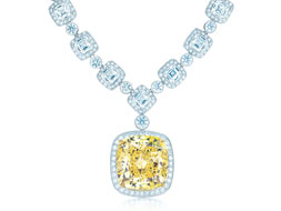 蒂芙尼蜚聲國(guó)際,彩鉆功不可沒。Blue Book華貴珠寶系列中,這款由一顆20.34克拉艷彩黃鉆吊墜、37顆蒂芙尼Legacy鉆石和674顆圓鉆組成的項(xiàng)鏈別具風(fēng)格,黃鉆吊墜具有極高的飽和度、色散光度和亮度,是蒂芙尼能工巧匠的又一傾心之作。