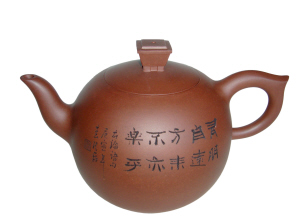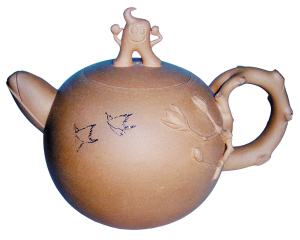 今年5月,世博會(huì)在上海隆重舉行,滬上知名壺藝設(shè)計(jì)師談桃林先生以紫砂為媒,借世博寓意,創(chuàng)意設(shè)計(jì)了“世博壺”和“玉蘭壺”,為這場(chǎng)萬眾矚目的盛會(huì)獻(xiàn)上了一份賀禮,同樣引起了收藏愛好者的濃厚興趣。 “世博壺”(右圖)通體圓潤如球,好比你我生活之家園——地球。壺身一側(cè),由中國書法家協(xié)會(huì)主席張海題書的孔子名言:“有朋自遠(yuǎn)方來不亦樂乎”,另一側(cè)則為陶泠先生繪制而成的上海市市花玉蘭花,該壺紫砂泥質(zhì)地優(yōu)良,外形線條流暢,涵義深遠(yuǎn)!坝裉m壺”(左圖)壺嘴與壺柄的設(shè)計(jì)以上海市市花白玉蘭為主體。兩朵嬌媚玉蘭依偎在好似地球的壺身兩側(cè),象征在上海舉辦的世博會(huì)將滬上海派文化灑向世界人間。壺頂站立著本屆世博會(huì)吉祥物海寶,嬌小可愛的海寶居于地球之頂端,跳起歡樂的舞蹈迎接五湖四海的朋友。壺的兩側(cè)也進(jìn)一步引申出了本款茶壺設(shè)計(jì)師的初衷。一側(cè)由中國書法家協(xié)會(huì)主席張海題書,另一側(cè)則由著名畫家張桂銘所繪的燕子飛躍圖,象征著通過本屆世博會(huì)要將中國文化播撒浸潤世界文化土壤之中。 “字依壺傳,壺隨字貴”,書畫名家參與紫砂壺的創(chuàng)作,往往受到收藏拍賣界的青睞,“相明石瓢壺”的天價(jià)再一次說明了這個(gè)道理。