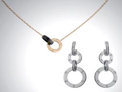 雙環(huán)恒久系列賦予了絕美象征:無(wú)論是項(xiàng)鏈、手鏈,還是耳墜,都將愛的美好與溫情誠(chéng)心寓于牽手雙環(huán)之中。愛的承諾化身緊扣的雙環(huán),如精致的標(biāo)點(diǎn),嵌入愛人們的喃喃細(xì)語(yǔ)中。 黑色高科技精密陶瓷與璀璨奪目的鉆石和熠熠生輝的玫瑰K金巧妙融合,奪目的光澤呼應(yīng)低調(diào)的啞光,明暗對(duì)比之下,深邃自如的氣質(zhì)傾心流出;而在閃亮的鉆石與白K金的相互映襯下,