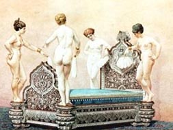 價(jià)值8萬法郎、鑲金飾銀并在床的四角裝置四座真人大小的銅質(zhì)彩繪裸女像的雕花大床,中央的機(jī)械系統(tǒng)連接音樂盒,當(dāng)侍女們扇扇時(shí),音樂盒就會(huì)開始演奏長(zhǎng)達(dá)30分鐘的美妙樂曲。