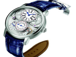 Piguet精心設(shè)計(jì)和制造的該款擒縱系統(tǒng),毋需上油潤滑,便可直接將動(dòng)力傳送至平衡擺輪,其振頻高達(dá)每小時(shí)43,200次。超高振頻可大幅提高表的走時(shí)精度。表殼:鉑金材質(zhì),圓形表殼,藍(lán)寶石水晶底蓋,可顯示機(jī)芯運(yùn)轉(zhuǎn)。表盤:琺瑯材質(zhì),斯圖亞特式指針,羅馬數(shù)字時(shí)標(biāo),雙軌分鐘刻度。機(jī)芯:手動(dòng)上弦機(jī)芯,配備愛彼獨(dú)家擒縱系統(tǒng),267枚零件,34枚寶石軸承,56小時(shí)動(dòng)力儲(chǔ)備,每小時(shí)振頻43,200次。功能:時(shí)、分、小秒針、動(dòng)力儲(chǔ)備顯示。