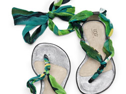 將奢華舒適完美演繹的美國休閑鞋品牌UGG Australia日前推出了全新春夏系列Shangri-La Col-lection(香格里拉系列)。該系列在綁帶涼鞋和羅馬鞋中融入了UGG的細(xì)致和舒適。以多種柔軟皮革、小山羊皮、絲綢為材料加以金屬的飾品搭配,讓整個(gè)系列充滿了時(shí)尚風(fēng)情,又不失品牌細(xì)膩的體貼。其中,Khole以時(shí)尚印花圖案的絲帶纏繞整個(gè)腳面和腳腕,讓雙腿更加美麗。
