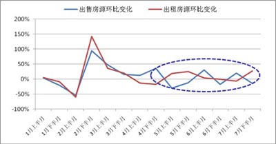 新政前出售房源與出租房源的環(huán)比變化基本都具備一定的季節(jié)性,即春節(jié)后出現(xiàn)高峰期,此后增速逐漸回落;而新政后初期,出售房源增長迅速,此后迅速回落,反之租賃房源開始明顯上漲,也就是說租賃房源上漲或下跌,比出售房源恰好滯后了一個周期。也就是說,此前二手房與租賃市場供應各自發(fā)展的軌跡,再新政后開始有了“微妙”的聯(lián)系,業(yè)主從競相出售到轉(zhuǎn)售為租,開始對租賃市場有所影響。