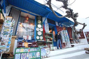 如今小鎮(zhèn)上已很少有先前的居民了,藍(lán)白屋子更多地成了一家家店鋪,可即使是琳瑯滿目的店鋪,也沒有什么喧囂,白皮膚、黑皮膚抑或棕色皮膚的店主人,靜靜地坐在門前的陽光下,或者綠蔭里。藍(lán)與白似乎將一切喧囂都過濾掉了。