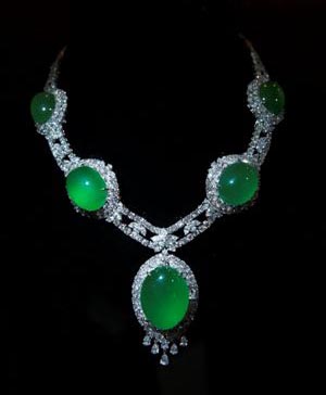 此天然翡翠首飾系列翠色深艷,種質(zhì)細(xì)膩,晶瑩透澈,顏色均勻,鑲工精美細(xì)致,是極為罕見(jiàn)的天然翡翠旦面套裝。它由九粒完美無(wú)缺的大粒旦面配鑲為項(xiàng)鏈、戒指及耳環(huán),設(shè)計(jì)構(gòu)思仔細(xì)體貼,每粒旦面均以耀眼的鉆石圍繞,佩戴者可根據(jù)需要,
