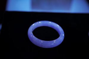 天然翡翠游龍如意紫玉璧:質(zhì)地細(xì)膩晶瑩,雕工精細(xì),紫色濃艷純正,均勻遍布。翡翠紫如意象征事事順心,圓滿如意,紫氣東來(lái)。如意上生動(dòng)地浮現(xiàn)著一尾螭龍,自古以來(lái)螭龍?jiān)⒁饷篮、吉祥的事物,同時(shí)也象征男女之間融洽的感情。在濃正紫色的翡翠襯托下,螭龍顯得格外矚目,如此完美的結(jié)合是值得收藏的珍品。 天然翡翠紫氣東來(lái)萬(wàn)福鐲:質(zhì)地細(xì)膩潤(rùn)澤,無(wú)一絲綹裂,傳統(tǒng)的圓條款式洋溢著古典韻味,紫色濃艷純正,令原本傳統(tǒng)的設(shè)計(jì)帶有時(shí)尚感,其造型象征和諧圓滿,有傳承意涵。手鐲與如意以同一材料分割而成,兩者的結(jié)合實(shí)屬絕美搭配。