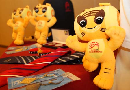 8月10日,2010年北京首屆世界武搏運動會特許產(chǎn)品、紀(jì)念郵品新聞發(fā)布會在中成天壇假日酒店舉行。會上發(fā)布了吉祥物、紀(jì)念章、鑰匙扣等紀(jì)念商品以及個性化郵票票折、明信片等特許郵品,供廣大體育迷與集郵愛好者購買、收藏。圖為武搏會吉祥物“冬冬”。