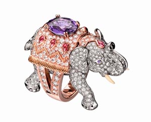 ring)是一個永恒的工藝作品。這款珍貴的大象式戒指輕輕地附在手指上,毫不費力地托起Maharadja寶藏中一個中央寶石,附在鑲滿各式珠寶的粉金地毯上,這一構思是從印度皇室御用的禮儀大象獲得靈感。作品得名源于印度語“大象”這個詞,在吉卜林(RudyardKipling)的小說森林王子(The