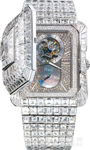 .35克拉祖母綠切割美鉆,奢華無(wú)比。輕觸第一枚鉆石按鈕,白色珍珠貝母表盤緩緩出現(xiàn)在眼前,設(shè)計(jì)簡(jiǎn)約,光澤獨(dú)特迷人,時(shí)間刻度由方形切割美鉆鑲嵌而成,配備伯爵56P石英機(jī)芯。而按下第二枚鉆石按鈕后,即能欣賞浮動(dòng)陀飛輪機(jī)芯的美妙運(yùn)作。得益于在超薄機(jī)芯領(lǐng)域的深厚功力,雙層腕表一直是伯爵的拿手好戲,一枚鑲滿鉆石的雙神秘開(kāi)關(guān)設(shè)計(jì)腕表不僅將伯爵善于結(jié)合頂級(jí)珠寶與制表工藝的特質(zhì)發(fā)揮得淋漓盡致,更讓這枚腕表成為一件獨(dú)一無(wú)二、美不勝收的藝術(shù)品,達(dá)到登峰造極的完美境界。