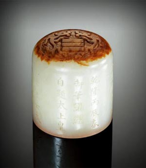 2010年4月8日,在香港蘇富比“中國瓷器及工藝品春季拍賣會”上,清乾隆御寶題詩“太上皇帝”白玉圓璽(以下簡稱“白玉圓璽”)成為整個拍場的亮點。該方圓璽曾出現(xiàn)在2007年香港蘇富比的拍賣場上,當時以4625萬港元刷新了御制印璽的世界拍賣紀錄,作品再次上拍,引發(fā)多方關注。 拍賣當日,現(xiàn)場競拍異常激烈,拍賣價格呈階梯狀不斷上升。在16輪競拍之后,一位現(xiàn)場買家以8500萬港元將這枚珍貴的印璽收入囊中,加上傭金,“白玉圓璽”的成交價為9586萬港元。時隔兩年,這一方御用印璽在拍場上的價格就翻了一番,升值4000多萬港元。
