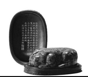 今年6月,在北京保利5周年春拍古董珍玩專場(chǎng)上,清乾隆“乾隆御用”御題詩(shī)澄泥伏虎硯及紫檀蓋盒以1400萬(wàn)元成交,打破硯臺(tái)拍賣(mài)世界紀(jì)錄。今年5月,在中國(guó)嘉德2010春拍“翦淞閣——文房清供”專場(chǎng)上,清康熙御制松花石龍馬硯以425.6萬(wàn)元高價(jià)成交,同樣引人注目。