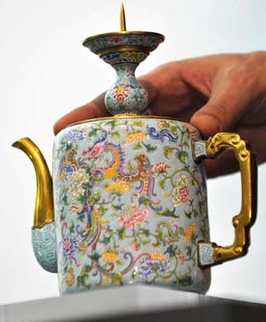 清雍正御制金胎畫琺瑯淺綠地“丹鳳呈祥”圖蓋壺。新華社記者 黃曉勇/攝 |