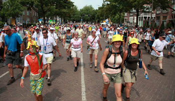 7月20日凌晨3點(diǎn),荷蘭西部小城奈梅亨。盡管正值夜最深沉之時,卻有一大幫人成群結(jié)隊(duì)地開始穿城而行。這些人既有英姿颯爽的各國軍人,也有頭發(fā)花白的耄耋老者,還有青春活潑的少年學(xué)生,而更多的,則是普普通通的民眾。 上述這一幕如果讓不明其由的人看起來,似乎頗有些怪異,但實(shí)際上,它卻是一場多達(dá)4萬人參加的節(jié)日的序幕——奈梅亨4日徒步節(jié)。 世界上的節(jié)日千奇百怪,但是以走路為主題而進(jìn)行狂歡的節(jié)日卻甚為少見。1909年,奈梅亨當(dāng)?shù)氐囊恍┤碎_始組織一項(xiàng)徒步活動,最初僅僅是針對軍人而設(shè)立的。但是隨著近百年來的發(fā)展,這項(xiàng)全球最古老的徒步活動如今已經(jīng)吸引了越來越多的普通民眾參與,成為全球規(guī)模最大的多日徒步活動。而且,雖然活動以徒步行走為主題,但是在徒步行走開始之前,整個奈梅亨小城都會陷入一連幾天的狂歡,大型歌舞、盛裝巡游等等,讓盛夏的艷陽為人們宣泄激情提供最好的陪襯。 據(jù)活動主辦方介紹,今年的徒步節(jié)盛況空前,由于報(bào)名者太多,組委會不得不抽簽“淘汰”了約3000人。來自23個國家和地區(qū)的軍人以及60多個國家和地區(qū)的各界民眾,分為30公里、40公里和50公里3個組別,從20日凌晨開始了連續(xù)4天的徒步行進(jìn)。換言之,參加徒步節(jié)的選手,最高需要在4天時間內(nèi)連續(xù)行走200公里。 由于往屆活動中出現(xiàn)過高溫天氣導(dǎo)致民眾發(fā)生意外的情況,因此組委會今年特別安排選手們凌晨3點(diǎn)出發(fā),以避開高溫。選手們從奈梅亨市區(qū)出城,沿鄰近城鎮(zhèn)繞行,并最終回到市區(qū)。 時值盛夏,盡管選手們從凌晨就開始陸續(xù)出發(fā),但是在行走了約摸三四個小時之后,正值疲勞襲來之時,太陽卻又躍上頭頂,無疑成為對人們意志的最大考驗(yàn)。許多選手都在脖子上搭條汗巾,而許多住在沿途的民眾也自發(fā)為選手們送上飲料。炙熱的驕陽,枯燥的行走,但是整個隊(duì)伍中卻不乏歡聲笑語,整個活動充滿了歡快的氣氛。 一位荷蘭老先生對記者說:“我參加這個活動已有10多年了,以往都是參加50公里的,只是今年歲數(shù)大了,才改成40公里。”另一名荷蘭中學(xué)生告訴記者:“我是聽朋友介紹才知道這個活動的,當(dāng)時就覺得很有意思,很想?yún)⒓。今年我是第一次參加這個活動,我也不知道能不能堅(jiān)持走完4天,但是我想挑戰(zhàn)一下自己! 直至午間時分,開始陸續(xù)有人抵達(dá)終點(diǎn)。依然保持整齊隊(duì)形前進(jìn)的,無疑是各國的軍人;而更多的人則在抵達(dá)終點(diǎn)的瞬間擺出各種各樣慶祝的POSE——或者作出勝利的姿勢,或者將汗巾拋灑向天空,或者與伙伴擊掌相慶…… “走路確實(shí)是件很平常,很單調(diào),甚至?xí)屇阌X得有些無聊的事情,但是能夠和幾萬人一起行走,一起挑戰(zhàn)自己,我覺得這會給我?guī)砟蟮目鞓贰保晃贿x手在抵達(dá)終點(diǎn)后說,“在這樣炎熱的天氣里,自己的汗水浸濕了衣服,而我也得到了最好的鍛煉,不僅僅是身體上,更關(guān)鍵是我自己的意志。”