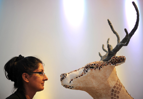 在英國(guó)倫敦舉行的可食用藝術(shù)展上,一名工作人員與用黃油和糖制作的馴鹿頭展品合影。