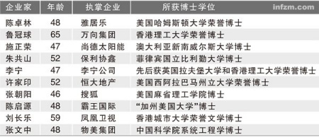 “榮譽博士”),占比42%。 42人當中,頭頂博士帽的有近10人。不過,這10人當中,除朱共山等花錢抄近道修得的海外博士,以及如魯冠球等后來獲得的榮譽博士之外,按部就班、不打折扣的博士學位獲得者鳳毛麟角,尚德太陽能的掌門人施正榮便是其中之一。 施正榮兩年前曾被通用電氣高管羅琳·波爾森稱為是“10年后超過比爾·蓋茨的全球巨富熱門人物”,從長春理工大學本科畢業(yè),到赴中科院上海光學精密機械研究所念碩士,再到澳大利亞新南威爾士大學獲得博士學位之后,他才開始參加工作,在澳大利亞奮戰(zhàn)了8年,然后于2000年回國創(chuàng)業(yè),成立無錫尚德。從嚴格意義上來說,他是學者創(chuàng)業(yè)型的富豪和企業(yè)家,對習慣了“野蠻生長”的中國企業(yè)家們來說,這種路徑顯然是不可復制的。 不同于張朝陽和施正榮這種海歸博士,張文中等民營企業(yè)家則是在國內(nèi)高校拿到的博士學位。張文中是物美控股集團前董事長,1962年生于山東,本科和研究生都是在南開大學讀的,25歲取得碩士學位后被分配到國務院發(fā)展研究中心,五年后,他在擔任世界銀行和國家“863”科技基金支持的一研究課題組長中表現(xiàn)突出,受到部委領導好評,不久后他于中國科學院獲得系統(tǒng)工程學博士學位;1994年他在北京創(chuàng)建物美商城。 張文中2006年身陷囹圄,兩年后一審被判有期徒刑18年。引人關注的是,接替張文中任物美董事長的他的創(chuàng)業(yè)伙伴吳堅忠,亦有中科院系統(tǒng)工程學博士學位。更有趣的是,張文中的簡歷中稱曾到美國斯坦福大學做博士后研究,而吳堅忠曾在美國密歇根大學進行博士后研究工作,且與張文中時間段相同,真可謂“黃金搭檔”。 企業(yè)家在國內(nèi)高校讀博,常見的一種情形是該校原本就是其母校或相互之間有著緊密聯(lián)系。近兩年飽受爭議的中國最大民營擔保公司中科智集團董事長張鍇雍屬第一種情形,他是深圳市政協(xié)委員,1982年從中南礦冶學院(后并入中南大學)金屬材料系本科畢業(yè)時,他沒有想到自己最后在金融行業(yè)嶄露頭角,中南大學校友會的網(wǎng)站上稱張鍇雍后來“先后攻讀了經(jīng)濟學和國際金融學兩門博士學位的全套課程”,而中科智的官方網(wǎng)站上直接稱其獲得的是“金融工程學博士”。 國內(nèi)最大民營鋼企之一的河北建龍集團董事長、曾被稱為“鋼鐵首富”的張志祥屬后一種情形。他1989年畢業(yè)于浙江工業(yè)大學工業(yè)自動化專業(yè),1994年開始創(chuàng)業(yè),2000年時已聲名鵲起,之后除其母校外,他還與北京科技大學、東北大學合作頻繁,獎學金是一種合作基本形式。他同時與北京科技大學聯(lián)合成立了“特殊鋼技術聯(lián)合聯(lián)發(fā)中心”,并任東北大學校董會常務董事——搞校企聯(lián)合,推進建龍在東北的鋼鐵版圖。 2006年張志祥在接受一家媒體采訪時稱自己在東北大學讀冶金專業(yè)的博士,目前尚不清楚他是否拿到了博士學位。