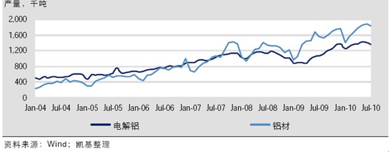電解鋁下游主要消費行業(yè)房地產(chǎn)和汽車增速下降,國內(nèi)鋁價表現(xiàn)仍比較疲弱,國內(nèi)氧化鋁價格出現(xiàn)上調(diào),原料成本上升將侵蝕電解鋁公司利潤,電解鋁行業(yè)的投資機(jī)會還需等待基本面出現(xiàn)轉(zhuǎn)好信號。 2010年1-7月國內(nèi)電解鋁累計產(chǎn)量954.6萬噸,同比增長41.9%,LME電解鋁價格目前處于回落調(diào)整中,而庫存還維持高位。