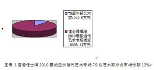 2010年70后藝術(shù)家所占的市場(chǎng)份額逐漸增大是一個(gè)最為顯著的現(xiàn)象。而這一點(diǎn)迥異于當(dāng)代藝術(shù)市場(chǎng)風(fēng)生水起的2007年。2010年春拍以香港蘇富比、香港佳士得、北京保利、北京匡時(shí)為例,尹朝陽(yáng)5張、管勇3張、李松松3張、李暉3件、韋嘉3張,總共上拍17張,較2007年市場(chǎng)規(guī)模增長(zhǎng)明顯。成交金額以2010年香港佳士得春拍為例,亞洲當(dāng)代藝術(shù)專(zhuān)場(chǎng)成交10095.47萬(wàn)元。70后年輕藝術(shù)家在佳士得春拍中成交1212.5萬(wàn)元是所占市場(chǎng)份額12%,