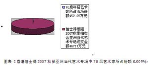而以2007香港佳士得秋拍亞洲當(dāng)代藝術(shù)專(zhuān)場(chǎng)46,717余萬(wàn)元成交(四億六千七百十七余萬(wàn)元),如火如荼的當(dāng)代藝術(shù)市場(chǎng)崛起之時(shí),而70后年輕藝術(shù)家總共成交4522500萬(wàn)元,所占的份額比例了了。兩相比較,70后年輕藝術(shù)家市場(chǎng)份額的增長(zhǎng)是絕對(duì)的,當(dāng)代藝術(shù)市場(chǎng)的總體縮水是相對(duì)的。
