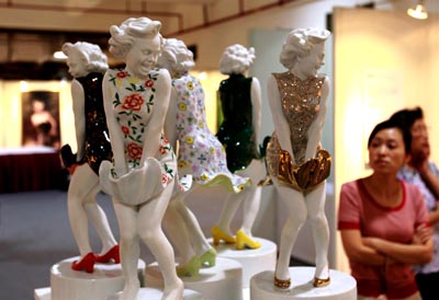 第十四屆上海藝術(shù)博覽會(huì)日前舉行開幕預(yù)展。此次藝博會(huì)的主題是“讓收藏成為風(fēng)尚”,匯聚了來(lái)自中國(guó)、德國(guó)、法國(guó)等14個(gè)國(guó)家的126家畫廊前來(lái)參展。在展出的作品中,不僅有羅丹、畢加索、達(dá)利、莫奈等世界藝術(shù)大師的原作,還有張大千、齊白石等收藏家夢(mèng)寐以求的中國(guó)大師的精彩畫卷,當(dāng)代藝術(shù)的名家陳逸飛、羅中立、陳丹青等的佳作也紛紛登場(chǎng)。全場(chǎng)約有6000余件油畫、國(guó)畫、版畫、雕塑、水彩、攝影、裝置、陶瓷等作品供藝術(shù)品收藏者選購(gòu)。圖為觀眾在欣賞陶瓷雕塑作品《夢(mèng)露的中國(guó)夢(mèng)》。