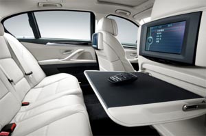 后排都標(biāo)準(zhǔn)配備了音頻系統(tǒng)的控制單元,包括集成在中央扶手中的一個(gè)控制器?烧郫B并帶照明的化妝鏡以及前后排的兩個(gè)杯座同樣是標(biāo)準(zhǔn)配置。后排獨(dú)特的閱讀燈和在乘客向下移動(dòng)中央扶手時(shí)可打開(kāi)的冷藏箱,作為選裝配置提供。為BMW