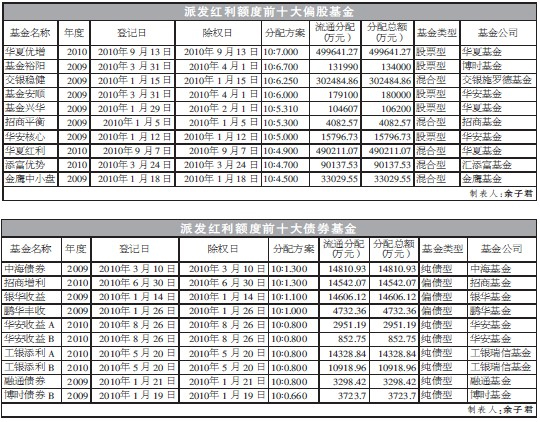 值得注意的是,9月以來,華夏基金分紅勢(shì)頭較猛。天相數(shù)據(jù)統(tǒng)計(jì)顯示,加上今日宣布分紅的2只債券基金,9月以來華夏基金旗下已經(jīng)有6只基金分紅,且分紅手筆較大。9月7日,華夏紅利和華夏成長(zhǎng)雙雙分紅,每10份基金份額分別派發(fā)紅利4.9元和3.2元,分配總額分別達(dá)到49.02億元和26.04億元;9月9日,華夏藍(lán)籌每10份基金份額派發(fā)紅利3.4元,派發(fā)總額達(dá)到40.76億元;9月13日,華夏優(yōu)增每10份基金份額派發(fā)紅利7元,派發(fā)總額達(dá)到49.96億元。