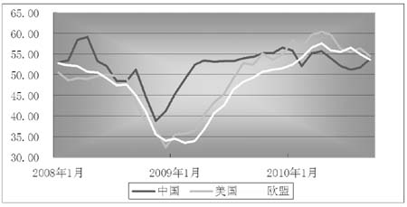 圖1:2008年1月-2010年9月主要經(jīng)濟(jì)體PMI指數(shù)走勢(shì)圖