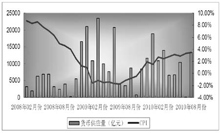 圖2:2008年1月-2010年8月中國(guó)貨幣供應(yīng)(M2)與CPI走勢(shì)