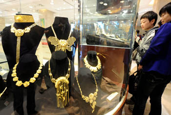 10月4日,顧客在北京菜百公司選購黃金飾品。近期,黃金價格屢創(chuàng)新高,但北京菜市口百貨公司黃金珠寶首飾銷售依然火爆。據(jù)介紹,國慶節(jié)以來,每天來菜百選購黃金珠寶首飾的顧客數(shù)量比節(jié)前大約增加40%。新華社記者 羅曉光/攝 |