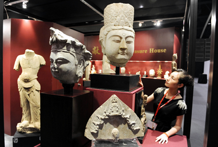 10月3至6日,亞洲最頂尖的古玩及藝術(shù)品博覽會(huì)——香港國(guó)際古玩及藝術(shù)品博覽(“FINEARTASIA2010”)在香港會(huì)展中心舉辦,呈獻(xiàn)約5000件跨越古今與東西方之藝術(shù)珍品,全場(chǎng)總值高達(dá)5億港元。圖為香港乾坤堂收藏的唐朝大理石雕塑《菩薩頭像》(上),價(jià)值達(dá)380萬(wàn)港元。