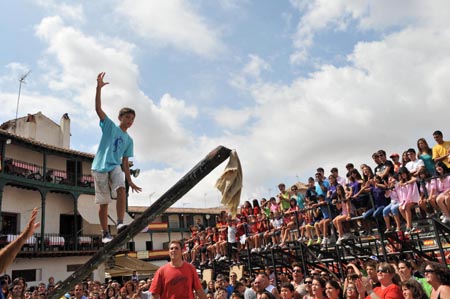 8月13日,西班牙馬德里自治區(qū)的欽瓊市為慶祝城市保護(hù)神節(jié)舉行“勇走滑木”比賽。欽瓊市中心的噴泉處臨時(shí)設(shè)立了一根斜放的木桿,上面涂抹油脂,以減少木桿的摩擦力,參加者光腳或穿襪子從木桿的一端向另一端前進(jìn),目標(biāo)是取下位于木桿頂端的毛巾,優(yōu)勝者將獲得西班牙特色食品——生火腿作為獎(jiǎng)勵(lì)。這一活動吸引了眾多勇敢者一試身手,但絕大部分參加者在半途就失足滑落水中,與獎(jiǎng)品無緣。(記者 陳海通/攝)
