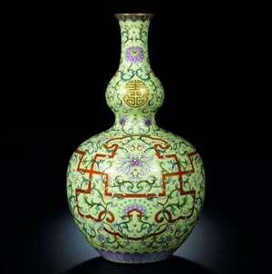 其中,清乾隆淺黃地洋彩錦上添花“萬壽連延”圖長頸葫蘆瓶以2億5266萬港元高價(jià)成交,刷新中國工藝品及瓷器之世界拍賣紀(jì)錄,該拍品由著名中國工藝品收藏家鄭張永珍博士投得。此前瓷器拍賣成交價(jià)世界最高紀(jì)錄一直由2005年7月12日英國倫敦佳士得公司拍出的一件青花瓷(鬼谷子下山)保有,成交價(jià)2.3億人民幣。