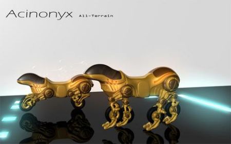 Acinonyx概念車融合了動(dòng)物與機(jī)器的諸多特征,是一種全地形車,即使遭遇最惡劣的地形也能輕松應(yīng)對(duì)。這款概念車在設(shè)計(jì)上受動(dòng)物影響更多而不是機(jī)器,令人著迷的動(dòng)物造型便足以說(shuō)明這一點(diǎn)。