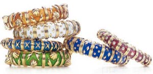 他運用這一工藝,在紅、綠、藍、玫瑰和白色的點綴下制作手鐲,這款作品也是杰奎琳-肯尼迪的最愛。照片中的她經(jīng)常佩戴這款手鐲,以至于該作品被稱作“杰姬的手鐲(Jackie