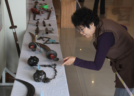滄州傳統(tǒng)武術(shù)器械展近日開展。此次展覽展出的200余件“武術(shù)之鄉(xiāng)”河北滄州武術(shù)世家及明清時期傳統(tǒng)武術(shù)器械珍品,以及一些罕見的明清武術(shù)文獻資料,都是由當(dāng)?shù)孛耖g收藏人士收集、征集到的。所展的武術(shù)器械及文獻資料大都是首次亮相。圖為市民參觀展出的古代傳統(tǒng)武術(shù)器械。新華社發(fā)