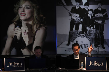 日前,朱利安拍賣行在澳門十六浦度假村酒店舉行好萊塢《傳奇》巨星拍賣會,共拍賣434件好萊塢巨星名人的珍品,包括“華人之光”李小龍在電影《死亡游戲》中所穿著的鞋子、邁克爾·杰克遜多套華麗舞臺服飾等。新華社發(fā)
