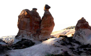 卡帕多奇亞最大的特點(diǎn)就是眾多聳立在平地上形狀奇特的小山峰,其外觀如石筍、似煙囪,不一而足,蔚為奇觀。它們是由數(shù)百萬(wàn)年前三座火山噴發(fā)后散落的灰燼凝結(jié),再經(jīng)歷數(shù)千年風(fēng)化和湖河雨水沖刷逐漸形成。