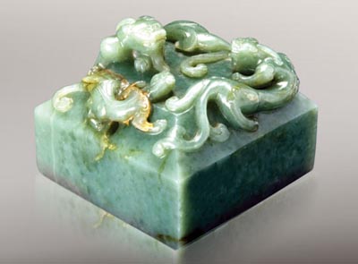 從上半年拍賣市場中國玉器成交記錄中可以看出乾隆玉器是今年的市場熱點。4月8日香港蘇富比春拍中,乾隆帝御寶交龍鈕玉璽以2026萬港元拍出,此璽為法國吉美家族舊藏。2007年秋拍此件以760.76萬港幣成交,不到3年時間,上漲了約2倍。同樣來自法國吉美家族舊藏的乾隆御制白玉蛟龍鈕“自強不息”寶璽,6月4日在北京保利拍至5656萬元。