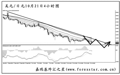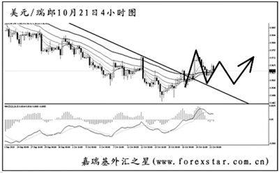 ▲美元兌瑞郎創(chuàng)出2008年低點0.9615的新低之后未能加速下行,短線強(qiáng)力反彈,已將下降趨勢線順利升破。從日線圖上看,美元兌瑞郎的跌勢沒有遭到任何的破壞。匯價在對趨勢線發(fā)生回抽,由于目前的價格已經(jīng)很低,美元兌瑞郎再創(chuàng)新低的概率不大,后市將以震蕩上行為主。
